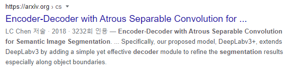 18년도에 나온 논문으로 3232회 인용되었다. 구조적으로 17년도에 발표된 DeepLabv3에 decoder 모듈을 더한 것이 특징이다.