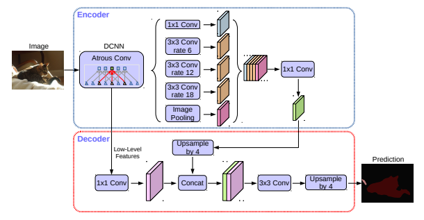 더 자세한 구조는 아래 그림과 같다. Deeplabv3에 간단하지만 효과적인 Decoder 모듈을 더함으로써 경계선 부분의 정확도를 향상시켰다.